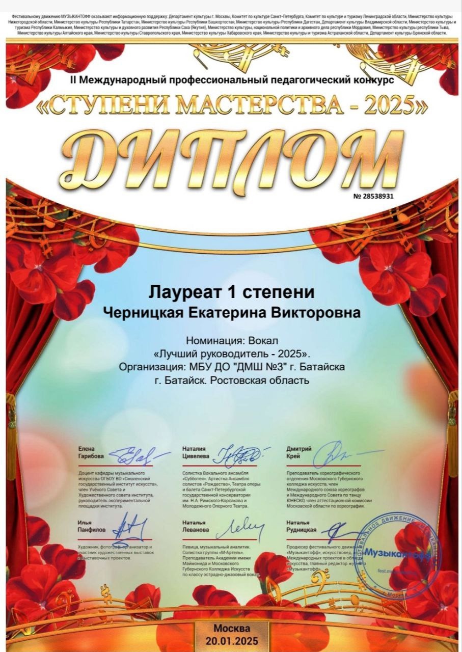 Преподаватель по классу эстрадного вокала батайской детской музыкальной школы №3 Екатерина Черницкая стала Лауреатом I степени в Международном профессиональном конкурсе педагогического мастерства.