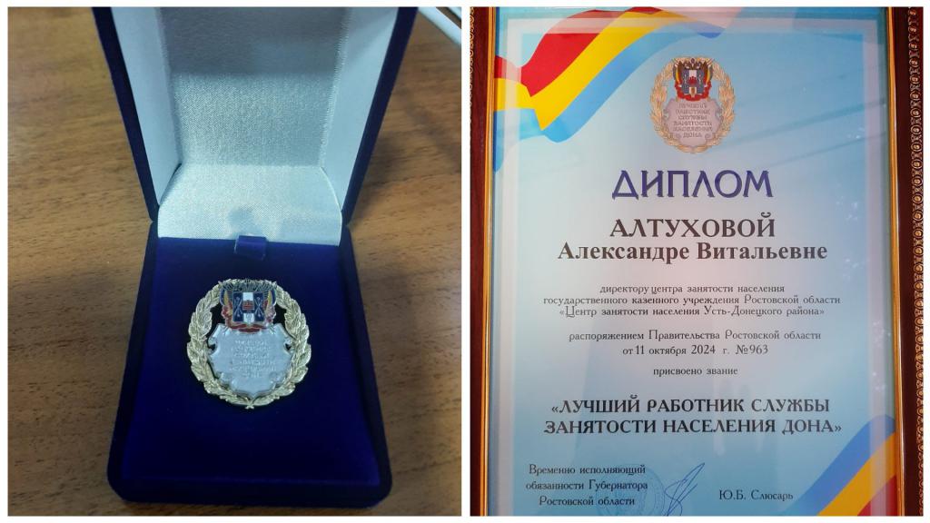 Руководителю «Центра занятости населения Усть-Донецкого района» Александре Алтуховой за многолетний, плодотворный и профессиональный труд присвоили звание «Лучший работник службы занятости населения Дона» с вручением нагрудного знака и диплома.